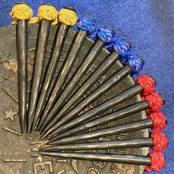 These marlinspikes are made on site in the Kenneth D. Kramer Blacksmith Shop. Sailors use this tool to loosen knots and to splice ropes on ships of all sizes. They are still in use today, even by our very own Merrymeeting crew! These marlinspikes are representative of an artifact currently on display in the Mill & Joiners Shop. Each one is hand forged and one of a kind. The length is approximately 6 1/2". The monkey fist knot is approximately 1" in diameter.