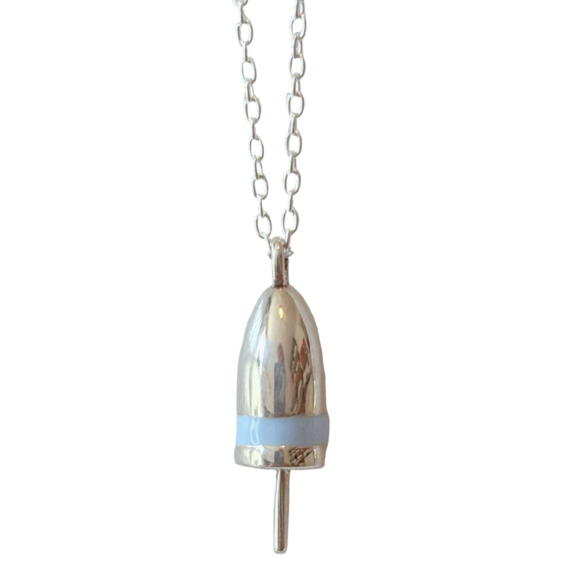 NEW! Now in color! Carry the spirit of the sea with you wherever you go. Capture the essence of coastal charm with this sterling silver Lobster Buoy Pendant, an original design inspired by the lobster buoys that dot the waters of the Maine Coast. Handcrafted with care in New England, this pendant is a tribute to the hardworking lobster industry and the maritime traditions that define coastal living. Expert craftsmanship, made from high-quality sterling silver, this pendant features intricate detailing that reflects the authentic shape and style of a traditional lobster buoy. This pendant is a meaningful piece for those who love the ocean, appreciate maritime history, or cherish the hardworking spirit of lobstermen and women. Whether as a gift or a personal keepsake, the Sterling Silver Lobster Buoy Pendant is a timeless reminder of the beauty and heritage of Maine's coast. The Buoy is 1" high by 1/4" wide. The stripes are two part colored epoxy applied to a channel "well" in the buoy. From the maker, "It should hold up pretty well in the shower, I'd stay away from salt water, which isn't great for the sterling either." So best to remove your necklace before going for a plunge in the Atlantic!