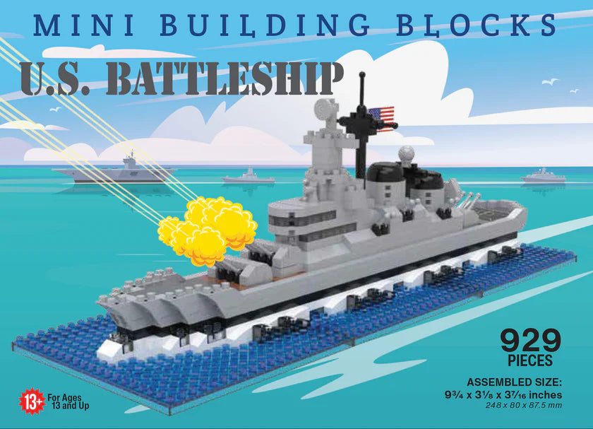 Construct a striking U.S. Battleship with this Mini Block Set! Featuring 929 blocks, firing cannons, and a display-ready base, this set is perfect for military enthusiasts ages 13 and up. 929 pieces. Made in the USA. Assembled size 9 3/4" x 3 1/8" x 3 7/16".